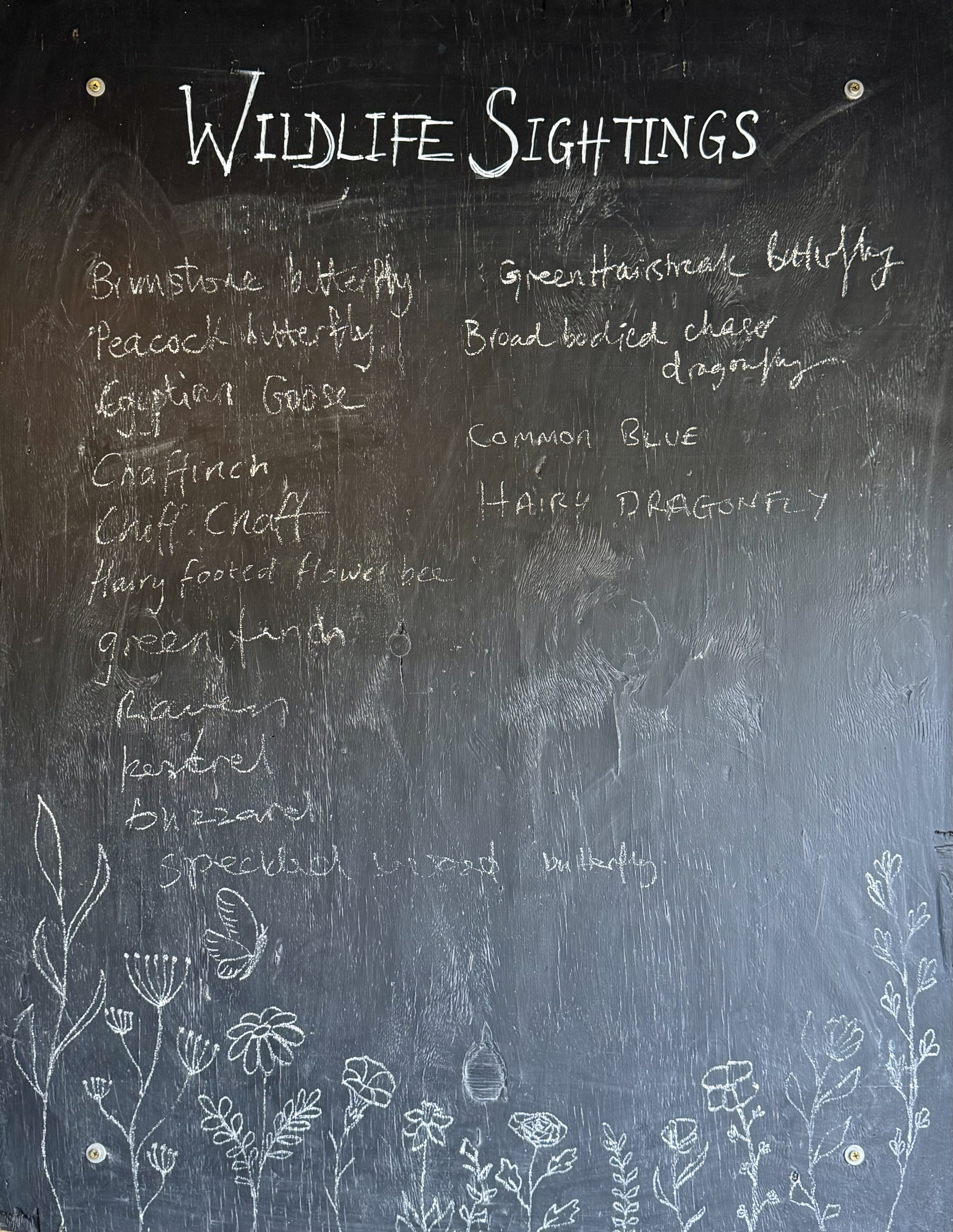 さて、最初の黒板の写真「WILDLIFE SIGHTINGS」は、ネップで、トム(長くなるので継承略)がデザインしたウォールド・ガーデンを訪問する前にアップルハウスで講座を受けた部屋の入り口で見た看板。